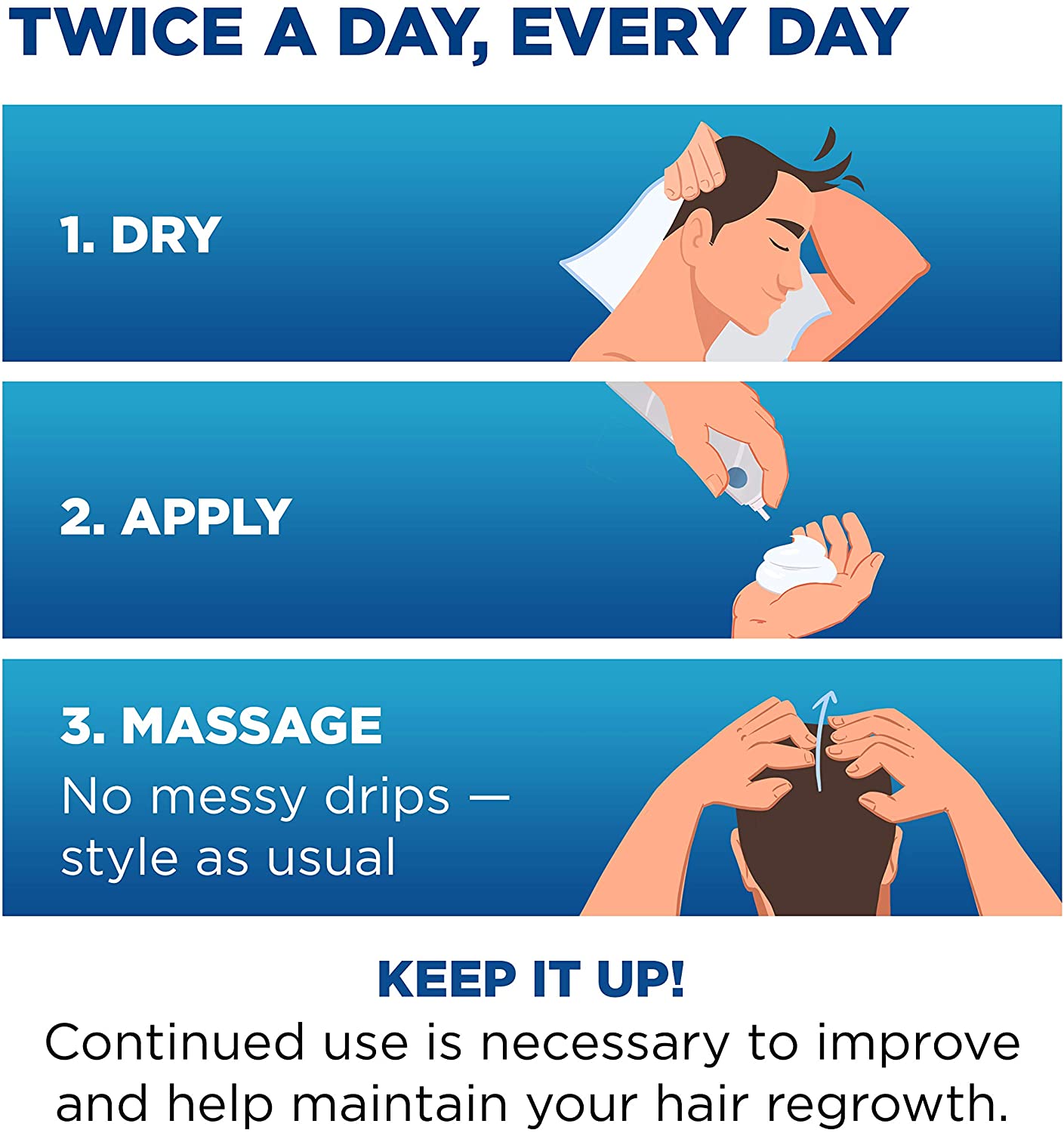 - Three 60 gram canisters of unscented, quick-dry foam. Apply 1g of foam, 2 times a day to the scalp in the hair loss area. Massage into scalp with fingers, then wash hands well. Continued use is necessary to maintain your hair regrowth.
